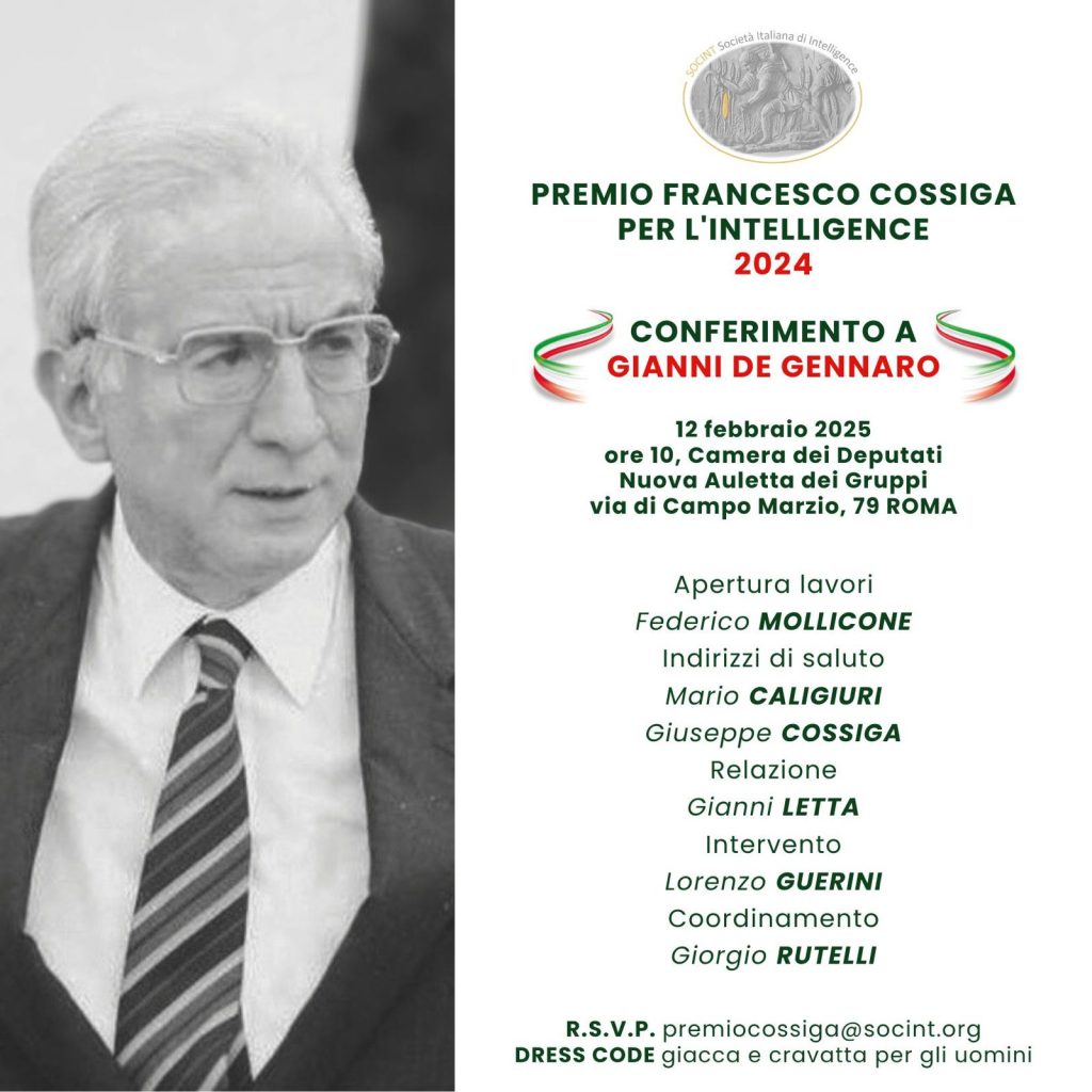 La Società Italiana di Intelligence (SOCINT) assegnerà il Premio Francesco Cossiga per l’Intelligence 2024 al prefetto Gianni De Gennaro.