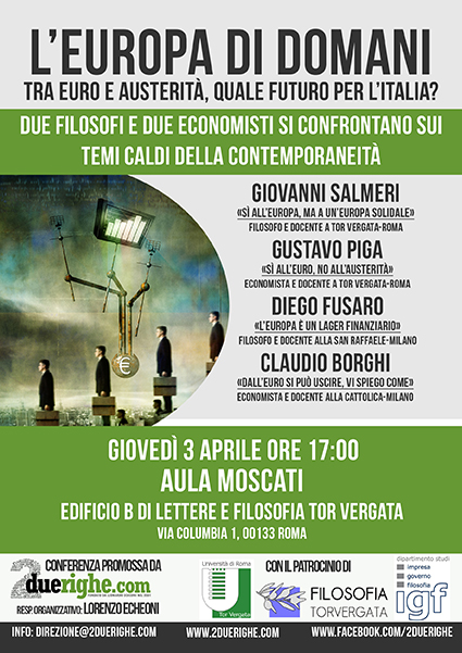 Giovedì 3 Aprile alle ore 17,00 all’Università di Roma “Tor Vergata”, quattro personaggi di grande spessore intellettuale si confronteranno nella conferenza “L’Europa di domani, tra euro e austerità, quale futuro per l’Italia?”: Gustavo Piga, economista e docente all’Università di Roma “Tor Vergata” e Claudio Borghi, economista e docente all’Università Cattolica di Milano; Giovanni Salmeri, filosofo e docente all’Università di Roma “Tor Vergata” e Diego Fusaro, filosofo e docente all’Università Vita-Salute San Raffaele di Milano. Due economisti e due filosofi sono chiamati a discutere uno dei temi più attuali dell’epoca storica che ci troviamo a vivere.