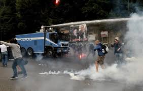 Intorno alle 9,00 si radunano i primi manifestanti all’ingresso della stazione della Metropolitana dei Colli Aminei, sotto una leggera pioggia. Il corteo dopo circa un’ora si mette in moto. Uno striscione lunghissimo con la scritta: “Precarietà, povertà, disoccupazione, speculazione: Liberiamoci della Bce.” è innalzato da alcuni manifestanti dall”inizio della lunga marcia. Un furgone con altoparlante illustra i motivi della protesta ed invita la gente ad unirsi. C’è anche una scala che poco dopo servirà per un tentativo di assalto alla sede del summit da parte di un giovane; tentativo che però viene fermato. Il manifestante viene infatti bloccato dalla Polizia e condotto in Questura. Intanto, la tensione tra i manifestanti e il grande dispiegamento di agenti, in assetto di guerra, sale. La polizia spara alcuni idranti verso i manifestanti, alcuni dei quali coperti da maschere nere, rispondono con fumogeni. Nel corteo ci sono anche alcune donne del Movimento ucraino antifascista che denunciano le armate che stanno uccidendo il “Dobass.” Si grida e si marcia a tempo di musica. Gli slogan sono duri. All’incrocio tra viale Colli Aminei e via Nicolardi non si passa. Ci sono i “gendarmi”, con il casco. Sono molte le persone che, nel frattempo, scattano comodamente flash dai balconi delle loro abitazioni. Tre grossi petardi esplodono nei pressi del Tribunale dei Minori. Il corteo lungo la sua marcia riceve poi gli applausi di medici, pazienti e personale del Cto (Centro traumatologico ortopedico). Poi dopo lunga trattativa con i poliziotti, che promettono di rilasciare il giovane arrestato in precedenza, il corteo decide di cambiare percorso e dirigersi verso il centro città, passando per la Sanità e raggiungendo nel primo pomeriggio piazza Bovio, dove i manifestanti vengono raggiunti da Mario Avoletto, storico rappresentante del movimenti napoletani. La sua liberazione viene festeggiata con spari di mortaletti. La protesta finisce, I segnali da Napoli ora sono veramente tanti…