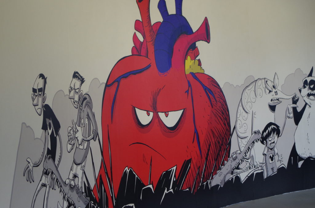 Capace di passare svariate ore negli stand delle Fiere o delle Mostre, per autografare con ‘disegnini’ le sue copie per i fan, ma capace anche di farsi risucchiare in serate nichiliste tra merendine, plumcake ed estenuanti prime (iterative) visioni delle ‘serie’ (tutto divano-e-Armadillo), Michele Rech è soprattutto capace di farci (amaramente) ridere di noi stessi: tra le pareti di cartone e di lamiera dell’allestimento di “Scavare fossati, nutrire coccodrilli”, rimbalzano improvvise, liberatorie risate, ogni volta sorpresi da un’iperbole, da una gag, dall’ennesima paranoia esagerata.