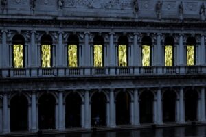 La cascata luminosa di Plessi nella quale emerge la scritta latina “Pax Tibi Marce, Evangelista Meus”, sembra un’offerta di Pace a quel Leone simbolo dell’evangelista Marco ma ancor più della città di Venezia, città che negli ultimi mesi ha lottato strenuamente per la sua stessa sopravvivenza.