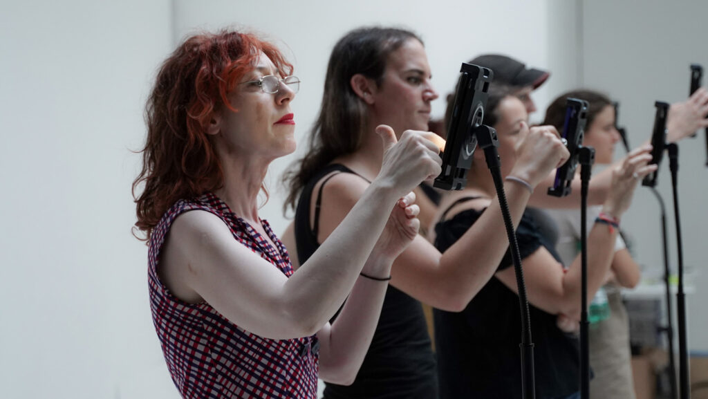 Ma la performance riproposta nella mostra ha l’intento invece di indicare una possibile via di ribellione alla strada tracciata dall’algoritmo e dagli algoritmi per le nostre scelte future e lo fa leggendo a voce alta e facendo ascoltare al pubblico e (e ai propri e nostri cellulari) il futuro che ciascuna delle partecipanti auspicherebbe per sé, ma recitato al presente indicativo. Una performance dal forte impatto, una call to action diremmo a rovesciare narrazioni e desideri e bisogni imposti. Un futuro migliore. Se possiamo declinarlo al presente possiamo farlo. Insieme naturalmente. Da brividi.