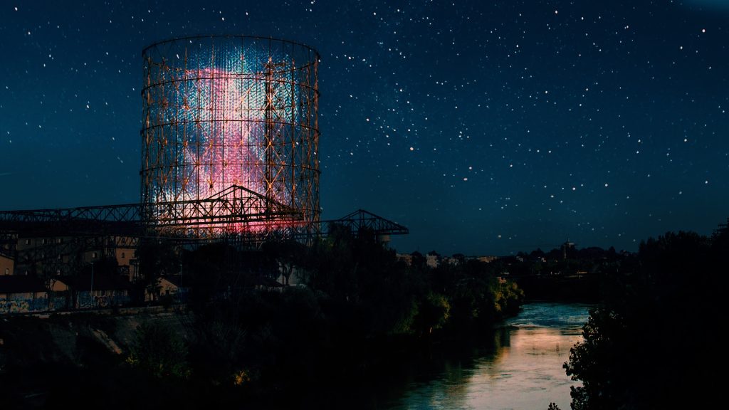 Nebula investirà il celebre cilindro del complesso del Gazometro, monumento simbolo del quartiere Ostiense e della Roma contemporanea, trasformandolo in un suggestivo spazio di osservazione intergalattica. Una spettacolare esperienza audiovisiva immersiva in grado di ricreare una costellazione fittissima che avvolgerà il pubblico completamente da ogni direzione, rendendo il Gazometro una sorta di telescopio che si innalza verso il firmamento, tracciando un collegamento tra cielo a terra, portando una porzione di cielo all’interno del cilindro.
