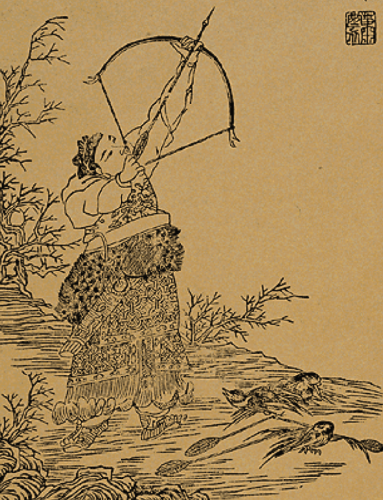 I pilastri del pensiero occidentale risiedono nel mondo greco, suonerà quindi familiare immaginare la luna sentendo menzionare la dea Selene; non sarà così la fanciulla Chang’e. Nonostante concetti universali accomunino civiltà e culture distanti tra loro, vedremo come ben diverse possono essere le strade intraprese per raggiungere narrazioni consimili. Durante il regno dell’Imperatore di Giada, tra gli immortali Houyi e Chang’e nasce un amore destinato ad essere osteggiato dall’invidia dei sudditi dell’Imperatore che deciderà di esiliare gli amanti, togliendo loro l’immortalità e condannandoli a una vita di fatiche. Houyi, costretto a divenire abile arciere per provvedere al sostentamento della coppia, tornerà utile all’Imperatore quando, in difficoltà per il grande rogo, nato dalla fuga degli uccelli a tre gambe, chiederà al suo vecchio suddito di salvare il mondo, lasciando un solo Sole (uccello a tre gambe) vivo.