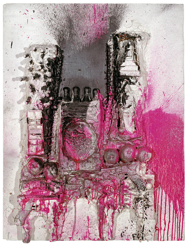 Come nella serie “le cattedrali” o “gli altari” risultanti da elementi tratti dall’apparato mitografico occidentale. C’è in esse, tutto il repertorio storico, allegorico e simbolico della società patriarcale e clericale, a partire dalla grande magnificenza.