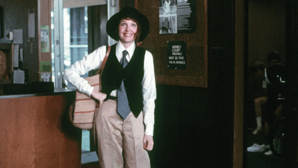 Ed è con lo stesso ruolo che marca anche un’era di stile dove le donne sono vestite e rappresentate con vestiti che non per forza devono renderle sexy, desiderabili e attraenti. I suoi look caratterizzati da giacche oversize, cravatte e pantaloni larghi l’hanno nel tempo resa un’icona di stile, soprattutto di quello androgino chic. Uno dei suoi costumi del film Annie Hall –gilet, camicia bianca e pantaloni larghi – ha lasciato un segno nello stile anni ‘70 ed ancora oggi rimane un’ispirazione di stile senza tempo.