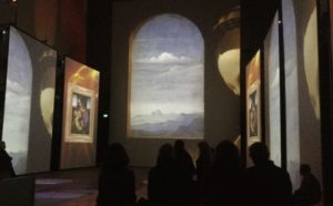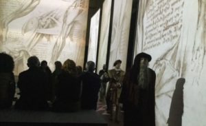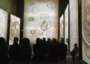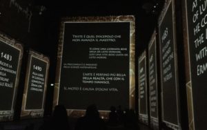 Tutto l’ambiente è coinvolto, e lo spettatore è immerso in questa sorta di acquario multimediale, dove non esiste centimetro che non sia usato come schermo. Experience Leonardo è questa esperienza straordinaria ma è anche altro.