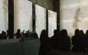 Sant’Anna, gli angeli, sapere che quel ricciolo che appare così naturale, è stato oggetto di anni di studio, come le pieghe delle vesti segnate dai corpi, e che qui vediamo nascere dalle linee accennate che mutano via via dando vita ai disegni e poi alle opere, e mentre sullo schermo di fondo appare l’immagine nella sua completezza, ai lati come dicevo, una sequenza di immagini dello stesso soggetto che sono poi proiettate con grande effetto sugli otto schermi e rimbalzate a ritmo incalzante anche sul soffitto e sull’enorme scenografica macchina per il volo umano sospesa sulle nostre teste.