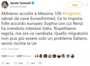 Il ministro dei Trasporti e delle Infrastrutture Danilo Toninelli si accoda, per l’ennesima volta, alle posizioni del leader leghista. Così su Twitter: «abbiamo accolto a Messina 106 migranti salvati da nave Eunavformed. Ce lo impone folle accordo europeo Sophia con cui Renzi ha svenduto interessi Italia. Rispettiamo la regola, ma ora va cambiata».