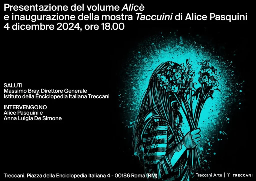 Mercoledì 4 dicembre presso la sede Treccani presso piazza dell’Enciclopedia a Roma, si è tenuta la presentazione di Alice: volume in uscita per Treccani il prossimo 6 dicembre. Il libro, a cura di Vincenzo Trione, offre un’immersione intima nel mondo creativo dell’artista romana Alice Pasquini, svelando il suo processo artistico e le sue ispirazioni. Insieme alla presentazione, si svolgerà l’inaugurazione della mostra Taccuini, collezione delle opere dell’autrice.