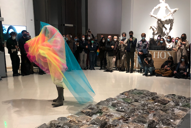 Nata durante il primo lockdown per instaurare un rapporto coi dati diverso dalla fruizione passiva imposta dal bombardamento dei bollettini di guerra cui eravamo tutti sottoposti, divisiva e isolante, con il coinvolgimento insieme a i due ricercatori di pochi soggetti, ha coinvolto stavolta 80 persone, dai 19 ai 76 anni di età, scelti tra coloro che avevano risposto ad una call, in una pratica condivisa, realizzata con il contributo di un team di creativi – Daniele Bucci, Stefano Capezzuto e Cecilia Marotta –, e in collaborazione con il Museo MAXXI di Roma, nell’ambito delle sue iniziative per #All4Climate. Ne è nata (anche) un’opera esposta nel Museo stesso il 6 e 7 novembre scorsi. La partecipazione attiva dei due progettisti al rituale è indicativa di una loro postura ben precisa di fronte alla Ricerca e all’Arte, parte intima della pedagogia del Nuovo Abitare: stare insieme nella comunità che impara.