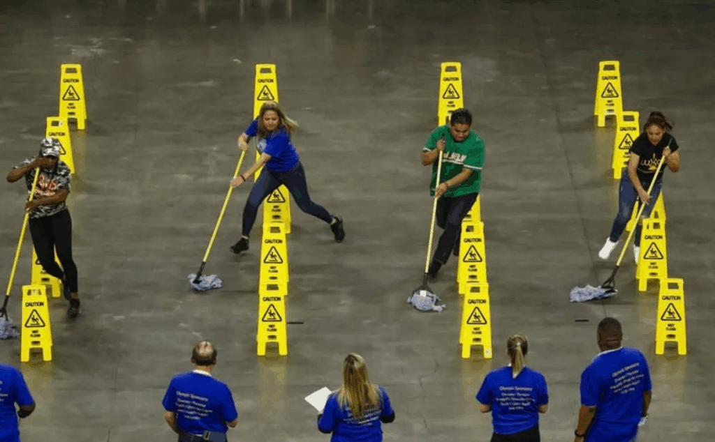 Un’altra disciplina che richiama le tipiche Olimpiadi è la staffetta del mocio. Qui, i concorrenti corrono passandosi il mocio come fosse una staffetta olimpica. Nel mentre, la squadra deve essere veloce, senza però lasciare aloni o zone bagnate. In questo tipo di disciplina, il lavoro di squadra è essenziale, insieme ad una grande coordinazione.