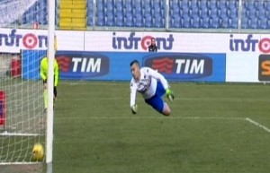 [giu]Chiffi: l’arbitro addizionale, giudice di porta, Chiffi, da posizione allineata e con visuale perfetta sbaglia clamorosamente la segnalazione del possibile 2-1 palermitano, scegliendo di non sventolare la sua bandierina dinnanzi al goal evidente. Chissà che quella di scatenare le consuete polemiche domenicali non si riveli un giorno semplicemente una scelta commerciale.
