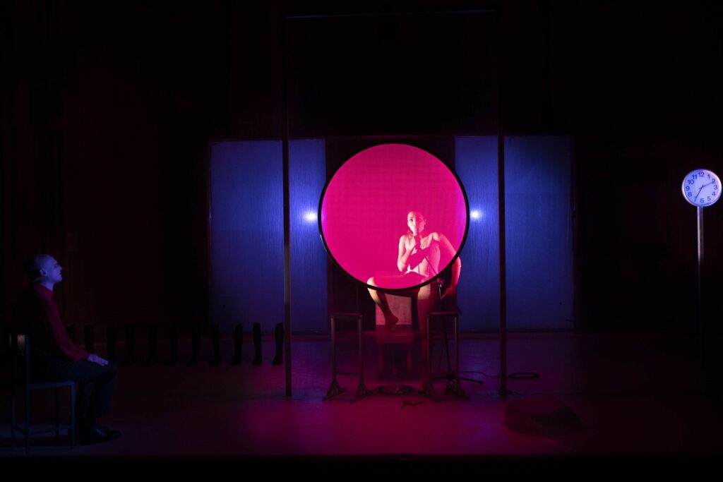La protagonista, Marta Pizzigallo, sola per quasi tutto lo spettacolo e con un’energia cosmica, è già sul palco. La vediamo attraverso una grande membrana velata racchiusa in una grande cornice rotonda sospesa, che cambia colore.