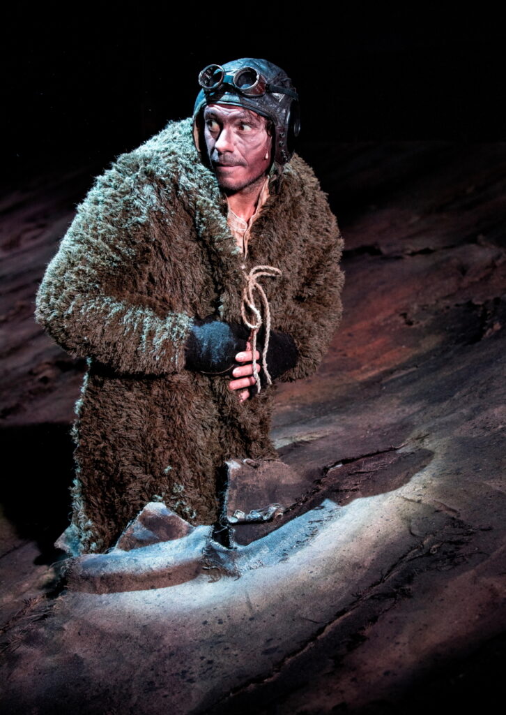 Da un buco, simile ad una buca di talpa, esce la testa e il busto di Pasotti. Questa volta ha una grande pelliccia, casco e occhialini da Barone Rosso. É una creatura mezza animale e mezza umana. Intuiamo senza poterlo vedere, il suo incessabile movimento sotto il telo opaco.