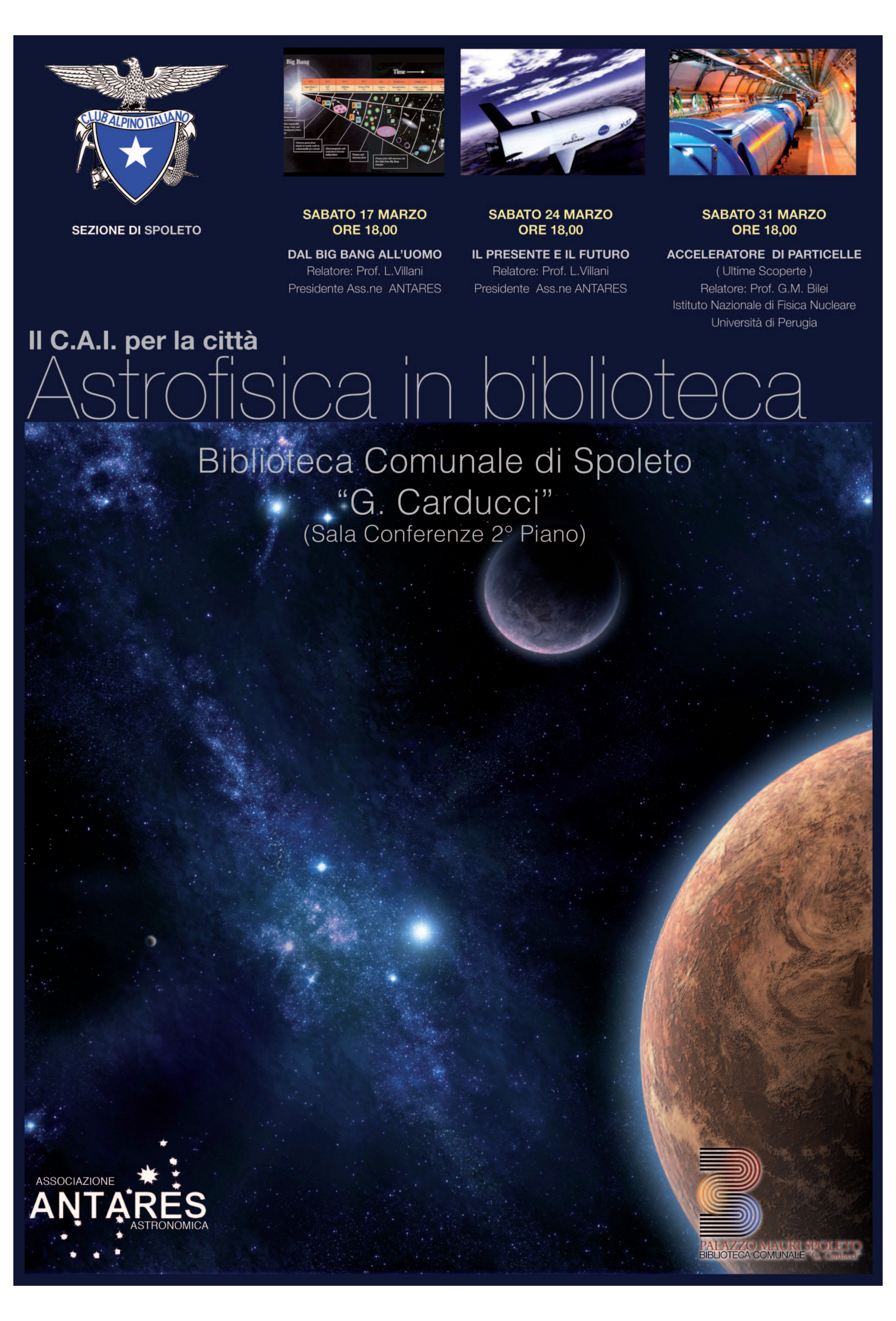 Si chiama “Astrofisica in Biblioteca” la serie di incontri che il CAI-Sezione di Spoleto ha organizzato insieme all’Associazione Astronomica Antares e che si svolgeranno nei prossimi tre sabato del mese, ovvero il 17, il 24 e il 31 marzo, tutti a partire dalle 18, alla Biblioteca Comunale “G.Carducci” di Palazzo Mauri.