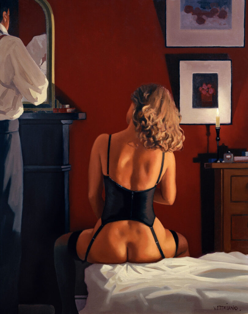 È singolare come Vettriano, nato in Scozia nel 1951 e morto a Marzo del 2025 sia stato a lungo snobbato per il suo percorso pittorico puramente autobiografico, lontano da prestigiosi ambiti accademici.