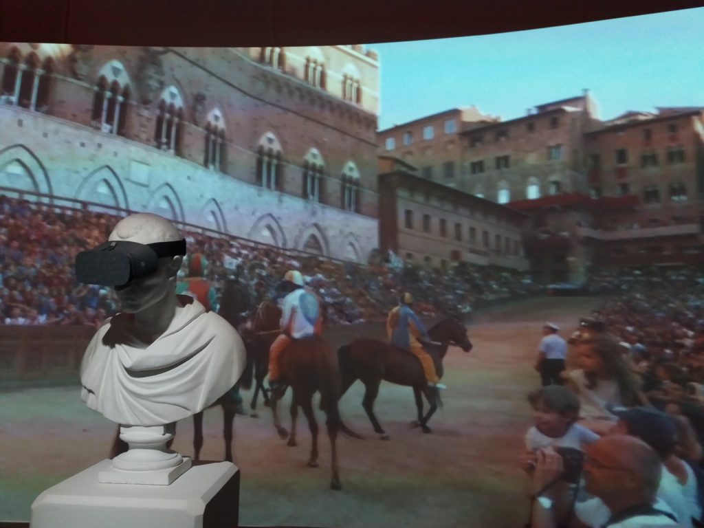 Siamo partiti così da Venezia e dai Gigapixel dell’Art Camera alla scoperta dei segreti del Canaletto e di come gli studi sulle sue vedute abbiano portato alla conoscenza del flusso delle maree nel XVIII secolo – un’opera da zoomare e ammirare in alta definizione. Sul lato opposto della sala invece, abbiamo avuto la possibilità di immergerci in Piazza del Campo e seguire il Palio di Siena a 360° indossando il visore Google DayDream e ascoltando storia, tempistiche e folklore dell’evento simbolo della città. Il Grand Tour ci ha portato poi all’interno del Teatro Massimo di Palermo, facendoci sentire protagonisti sul suo palcoscenico e, attraverso Google Earth VR, abbiamo passeggiato virtualmente anche tra le strade in stile architettonico arabo-normanno del capoluogo siciliano.