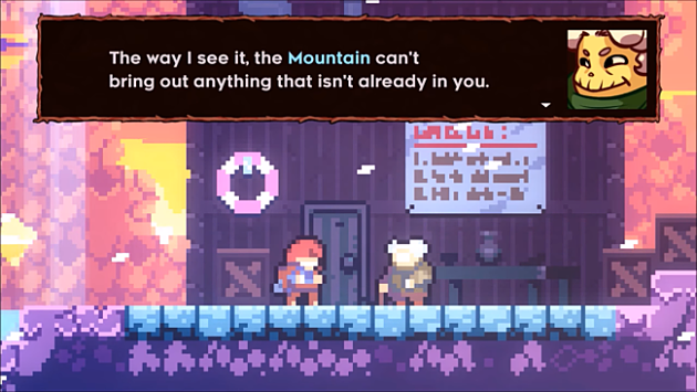 La vecchietta verrà incontrata anche più avanti nel gioco, e continuerà a mettere in dubbio la volontà di Madeline di concludere la scalata avvisandola che “La montagna non fa altro che tirare fuori ciò che si ha già dentro”.
