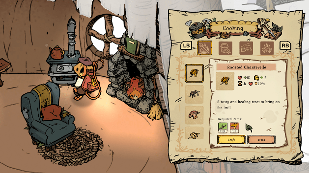Un aspetto particolarmente affascinante è la capacità del protagonista di cucinare ricette con le risorse della foresta: tè e infusi, torte, stufati, persino preparazioni con funghi esotici e insetti. Adorabile è la possibilità di lavorare ai ferri per realizzare abiti sempre più caldi, lavorare lino e lana. La maggioranza degli elementi sono craftabili illimitatamente, anche quando non ha senso che lo siano: per portare avanti il gioco ci basterà una sola ascia di granito, ma la troveremo comunque tra le opzioni del nostro laboratorio anche una volta realizzata. Per quanto possa sembrare voluto per poi vendere oggetti, questa funzionalità non ha alcuna utilità per molti elementi. C’è da dire che è difficile riempire completamente l’inventario gigantesco di casa, dov’è possibile lasciare quanto raccolto durante l’esplorazione e fare scorta di risorse. Inoltre, più avanti procediamo con la vicenda, maggiori sono le quantità di risorse unitarie trovate negli stessi luoghi.